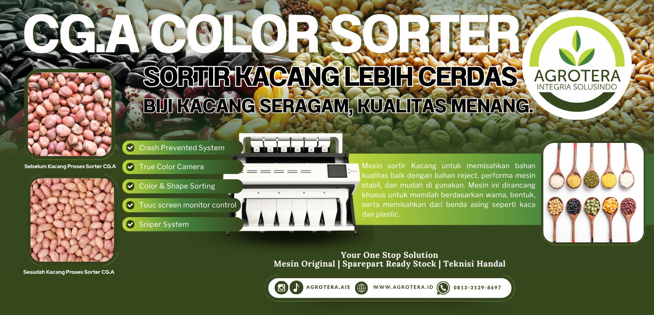 Saatnya tinggalkan cara lama. Biarkan CG.A Color Sorter bekerja untuk Anda, dan lihat sendiri perbedaannya. silakan hubungi kami melalui: WhatsApp: 0813-3129-8697 , Email: [email protected] , Website: www.Agrotera.id , Alamat Kantor: Ruko Icon 21, Jl. Dr. Ir. H. Soekarno Blok S No. 8-9, Semolowaru, Surabaya, Jawa Timur 60117, 0813-3129-8697 (Admin Sparepart), 0812-1689-8284 (Admin Mesin), 0813-5856-5495 (Admin Teknisi)